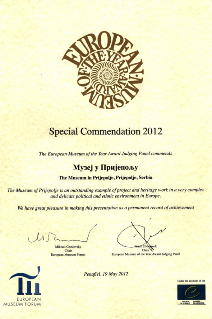 Одлука Судијског панела Европског музејског форума да се Музеју у Пријепољу, у конкуренцији 59 европских музеја, музеја Руске федерације и Републике Турске, додели Специјална награда, представља значајан догађај и велико признање не само за Музеј у Пријепољу и српску музеологију, већ за срску културу уопште.На конкурсу Европског музејског форума и Савета Европе за 2012. годину, за ову највећу музејску награду, не само у Европи, већ и у свету конкурисало је 59 европских музеја, укључујући руске и турске музеје. Први пут у историји српске музеологије и ширег региона Балкана Музеј у Пријепољу, конкурисао је за ову велику награду. Строги услови конкурса захтевали су реализацију великих националних пројеката, пројекте који су значајни за европску музеологију са значајним референцама, који су представљали услов за испуњавање веома обимне конкурсне документације. Судијски панел европских музејских експерата од великог броја пријављених музеја који су конкурисали, номиновао је 59 музеја, међу њима и Музеј у Пријепољу